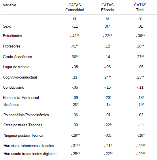Aunado, se analizó la asociación entre el conocimiento sobre los tratamientos digitalizados y las actitudes; para evaluar el conocimiento se utilizaron las preguntas que exploraban si los participantes habían visto o utilizado alguno de estos programas digitales. Se identificó una asociación negativa (rs = -.29 p < 0.01) entre el conocimiento y el puntaje total CATAS (Comodidad y Eficacia). El enfoque conductista y psicoanálisis/psicodinámico, el sexo y el lugar de trabajo no mostraron asociaciones significativas con las actitudes (CATAS Comodidad y Eficacia).