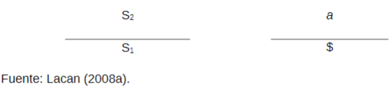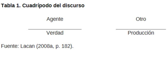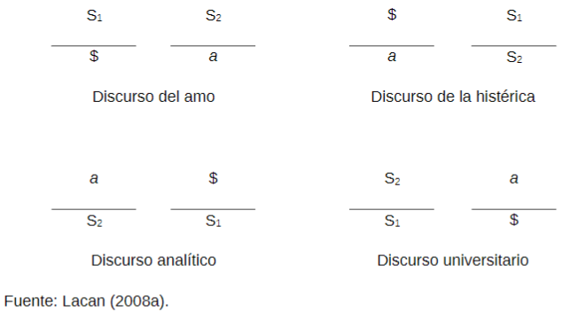 El psicoanálisis lacaniano aporta algunos elementos importantes en cuanto al lugar de la educación y su relación con el discurso. Lacan (2008a), entre los años 1969 – 1970, dicta su seminario número 17, titulado El reverso del psicoanálisis. En él Lacan constituye, a partir de elementos previos desarrollados en escritos y seminarios precedentes (Lacan, 2008b, 1995, 1967, 1966), la escritura de los 4 discursos, a saber: discurso del amo, discurso de la histérica, discurso analítico y discurso universitario, no es el propósito de este escrito establecer reflexiones en el campo concreto del discurso a partir del psicoanálisis, solamente retomaremos algunas elucidaciones sobre el discurso universitario. En este contexto, el discurso se genera a partir de una estructura de 4 lugares llamada cuadrípodo del discurso: