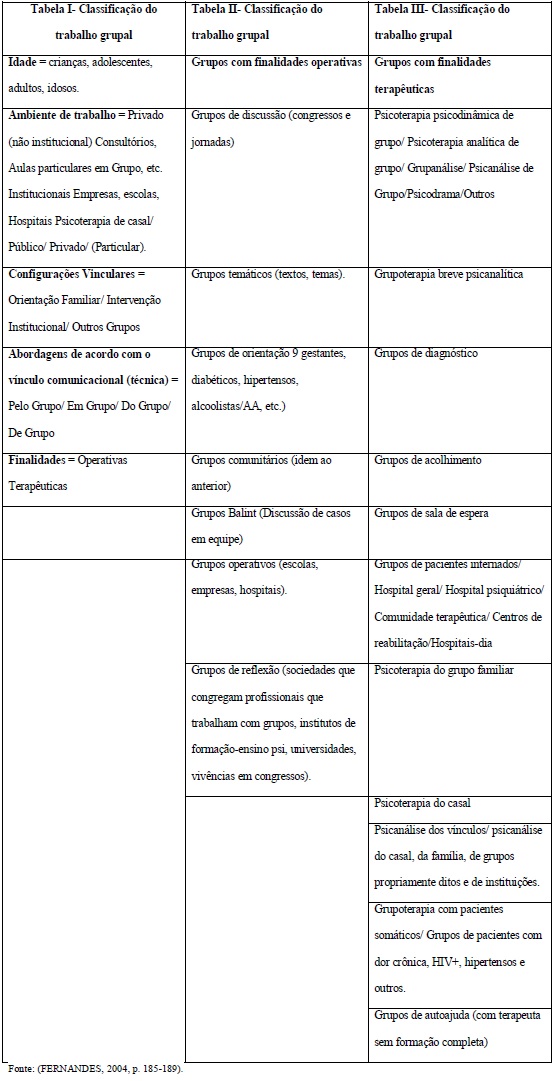 É importante que se compreenda a existência de várias modalidades no que se refere ao trabalho de intervenção grupal. Em sua obra "Grupos e configurações vinculares" Fernandes (2003) classifica os grupos de maneira didática por meio de tabelas demonstrativas: