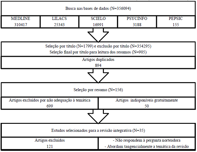A busca inicial dos artigos foi realizada com os unitermos e suas combinações, aplicando os filtros dos critérios de inclusão e de exclusão. Os estudos encontrados foram analisados novamente em termos de títulos e posteriormente pela leitura dos resumos, em novos procedimentos de filtragem de evidências. Os trabalhos recuperados a partir desse crivo foram lidos na íntegra, a fim de proceder a uma nova seleção, agora mais pormenorizada e a partir do texto completo. Estes procedimentos foram realizados por dois juízes independentes, ambos psicólogos e que trabalham com a temática. Caso houvesse discordância, um terceiro juiz poderia ser acionado. Após esse processo, os artigos que compuseram o corpus foram reunidos, organizados em uma planilha em termos de delineamento metodológico, ano de publicação, idioma de publicação e local de realização da pesquisa. A apresentação da revisão/síntese do conhecimento foi pautada nas recomendações do sistema PRISMA (Preferred Reporting Items for Systematic Reviews and Meta-Analysis) a partir dos critérios preconizados em sua lista de verificação (Moher, Liberati, Tetzlaff, Altman, & PRISMA Group, 2009), a fim de responder à pergunta norteadora. Mediante os resultados das pesquisas nas bases de dados e a questão norteadora, foram elaboradas categorias temáticas que permitiram discutir mais detalhadamente a produção veiculada, suas características e apontamentos.