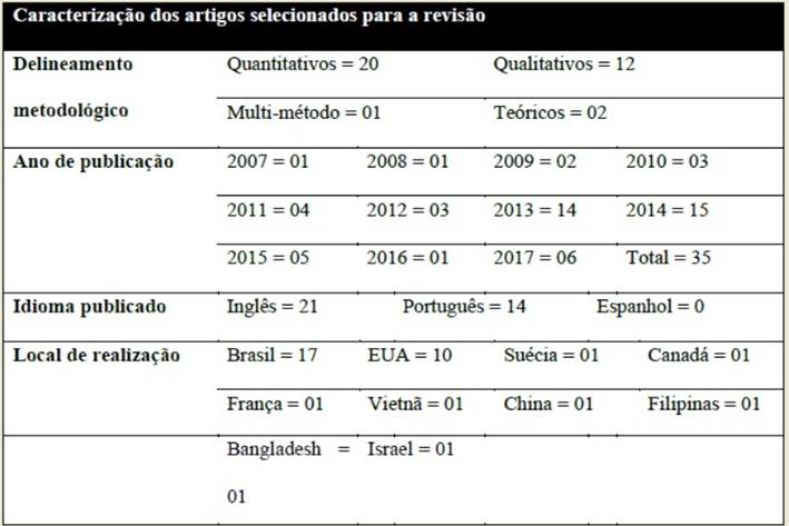 Após as etapas de busca, seleção e análise de evidências, 35 estudos foram recuperados para compor esta revisão integrativa. O fluxograma (Figura 1) representa esse processo. A Figura 2 apresenta a caracterização do corpus. Observa-se um predomínio de artigos cujo método foi quantitativo (57,1%), redigidos em inglês (60%) e realizados no Brasil (48,6%).