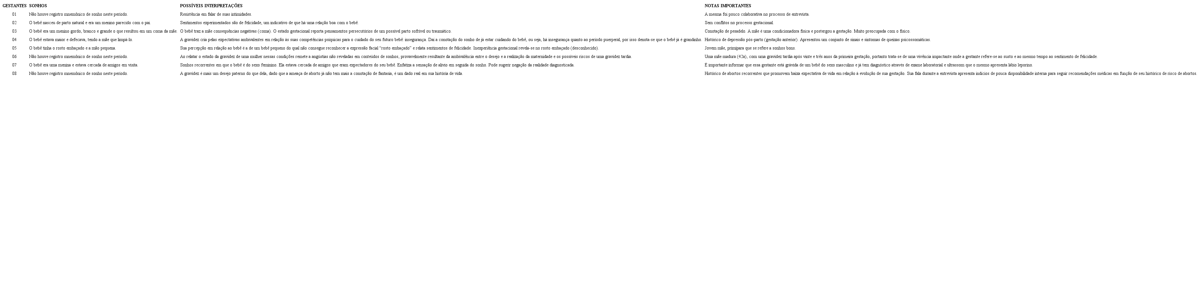 Finalmente, ao analisar-se a categoria Traduções Oníricas (Sonhos e Pesadelos) percebe-se que há presença de sonhos ou pesadelos durante a vivência gestacional, porém não há uma preocupação da equipe multidisciplinar, em particular da área psicológica, em escuta e análise para reflexão e interpretação das traduções oníricas possíveis, que poderiam possibilitar uma melhor compreensão das vivências estressoras e ansiógenas, bem como das emoções experienciadas pela gestante nesse período.
