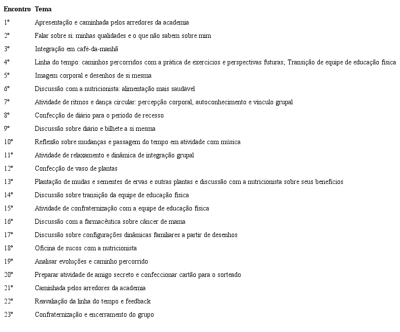 Ao longo dos 23 encontros realizados, descritos na tabela abaixo, foram trabalhadas temáticas consideradas pertinentes à proposta de tarefa do grupo em questão, em consonância com as demandas levantadas a partir da escuta individualizada das integrantes, bem como de conteúdos suscitados ao longo dos encontros.