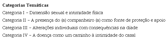 Quando falamos sobre as dimensões da intimidade em um relacionamento de casal entendemos que a mesma se estrutura em torno da confiança, partilha, revelação de vulnerabilidades, reciprocidades e sexualidade. No entanto, os resultados apontam que o adoecimento trouxe um grande impacto na dimensão sexual da díade. Tal prejuízo traz seus componentes fisiológicos, enquanto manifestações clínicas da doença, e os fatores psicossociais associados a patologia. Porém, com esta condição os casais podem encontrar, a partir da comunicação, e em muitas situações, a partir das intervenções voltadas ao casal, alternativas e formas de manejo com esta dimensão impactada, por exemplo, a possibilidade de encontrar atividades que possam ser utilizadas de forma a substituir o ato sexual e que ofereçam a satisfação do desejo de ambos. Neste sentido é possível pensar na vivência de uma intimidade para além do ato sexual, onde abraços, toques, beijos, carícias e palavras podem ser sentidas como expressões de afeto e cuidado (Davies, Sridhar, Newkirk, Beaudreu & O´Hara, 2012; Holmes, Yorke, Dutton, Fowler & Ryan, 2019; Hudson et al 2016; Lindau, Surawska, Paice & Baron, 2011; Perz, Ussher & Gilbert, 2013).