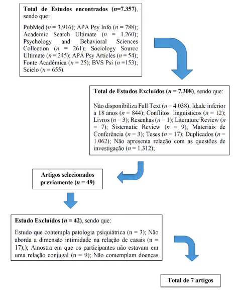 O período da busca foi compreendido entre 01/01/2010 até 31/12/2021 e de acordo com a metodologia proposta a este estudo, foi possível encontrar um total de 7.357 estudos, sendo que: PubMed (n = 3.916) Academic Search Ultimate (n = 1.260), Psy Articles (n=33), APA Psyc INFO (n = 788), Sociology Source Ultimate (n = 245), APA Psy Articles (n= 54), Fonte Acadêmica (n = 25), BVS Psi (n = 153), Scielo (n = 655) e Psychology and Behavioral Sciences Collection (n = 216). Dos 7.357 estudos, 1.062 foram automaticamente eliminados pois se tratava de publicações duplicadas, 12 foram excluídos devido a constrangimentos linguísticos, 4.038 não disponibilizavam full-text, 17 por serem teses/dissertações, 3 por serem livros, 1 por ser resenha, 1312 por não terem relação com as questões de investigação, 844 por apresentarem amostras com idade inferior a 18 anos, 7 por serem literature review, 9 por serem sistematic review, 3 por serem materiais de conferências. Assim sendo, 49 artigos foram selecionados para leitura e análise dos respectivos resumos. Destes, 42 foram excluídos por não cumprirem os critérios de inclusão: 3 foram estudos que contemplavam patologia psiquiátrica, 17 não abordavam a dimensão de intimidade na relação de casais, 9 em que os indivíduos não estavam em um relacionamento conjugal e 13 não contemplavam doenças crônicas. Deste modo, foram incluídos na revisão, 7 estudos para leitura e análise crítica. A Figura 1 apresenta o diagrama de fluxo da presente revisão sistemática.