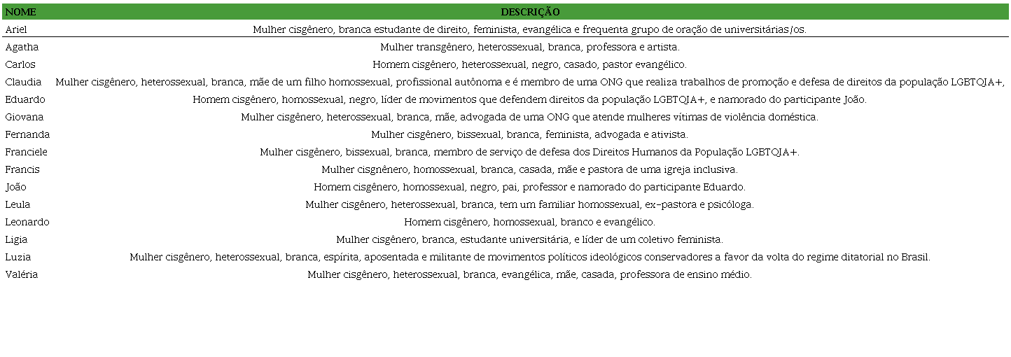 O grupo de diálogo foi realizado em uma cidade de médio porte no interior do estado de São Paulo, Brasil, que tem apresentado, ao longo dos anos, episódios de violação de direitos do público LGBTQIA+, nas escolas. O convite para participação na pesquisa levou em conta as orientações do PCP ( Chasin et al., 1996) de serem pessoas com opiniões distintas sobre o tema e que ocupassem lugares sociais diversos. 44 pessoas foram convidadas para participar do grupo e 15 participaram do grupo. A tabela a seguir apresenta a característica dos/as participantes tais quais elas/es se apresentaram nas conversas iniciais com as pesquisadoras. A média de idade dos/as participantes foi de 30 anos, a maior parte pertencente a classe média com relação ao seu nível socioeconômico.