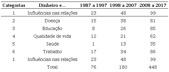 Na análise global, foi possível constatar que o tema cresceu a partir da década de 1990, sendo que, principalmente, a temática do dinheiro nas áreas de educação e saúde praticamente surgiu na década de 1980. Em se tratando da década de 1990, houve produtivas e numerosas publicações, contudo, foi no período de 2010 até 2017 que ocorreu um número extenso de publicações sobre o dinheiro, o que denota uma demanda de estudos e pesquisas direcionadas ao entendimento de uma sociedade capitalista em ascensão.