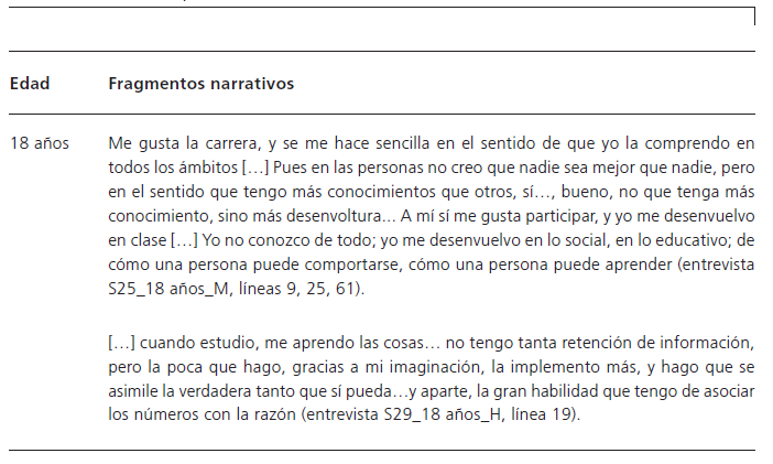 Al agruparse los fragmentos narrativos de la entrevista para la categoría dos, se observó que la percepción del adolescente sobre sí mismo como estudiante tiene referentes de comparación con sus compañeros de clase, pero tiende a disminuir con la edad. A los 12 años, es más común observar expresiones en las que el otro es un referente de comparación para hablar de su desempeño académico. Los de 15 años, aún se comparan académicamente con el otro, pero no con la misma intensidad que los de 12 años, al tiempo que toman distancia de ellos con base en sus capacidades intelectuales. A los 18 años, eso es más evidente, además de que el marcaje lingüístico de las referencias al otro es menos visible, aunque no desaparece del todo. Los fragmentos narrativos que aparecen en el Cuadro 5 son representativos de lo anterior.