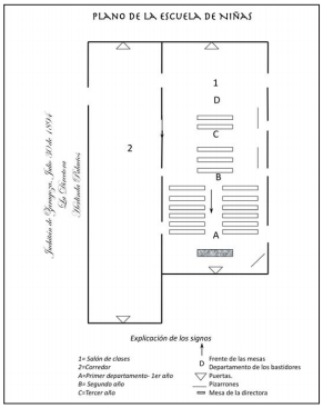 La arquitectura de la escuela de niñas era muy similar a la de niños, aunque solamente contaba con una profesora (figura 2). Ella acomodaba al primer grado cerca de su escritorio, dejando al resto detrás al centro, acaso, a modo de tener visibilidad casi absoluta de todas las alumnas.