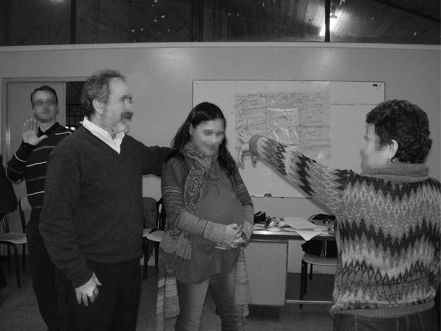 Para el diseño del dispositivo mencionado, apelamos al teatro imagen y realizamos adaptaciones para trabajar con las situaciones escolares relacionadas con los géneros y las sexualidades que las y los docentes identifican como problemáticas. Luego de una sesión donde nos presentamos y trabajamos sobre las ideas que tienen las y los docentes sobre los cuerpos y las sexualidades (Kohen y Meinardi, 2014), se les pide que identifiquen y sistematicen por escrito escenas que ocurren en la escuela relacionadas con las sexualidades. Luego se les solicita que señalen cuáles les resultan problemáticas. Una vez que han reflexionado sobre esto individualmente, se propone que algún(a) docente (voluntariamente) describa la situación elegida en una “imagen congelada”. La consigna es realizar una “foto”, una imagen quieta; para armarla, puede elegir docentes y ubicarlos en el espacio, además de “moldear sus cuerpos” para recrear una escena. Cuando se termina de armar la escena, trabajamos en cuatro etapas sucesivas con el fin de analizarla colectivamente: