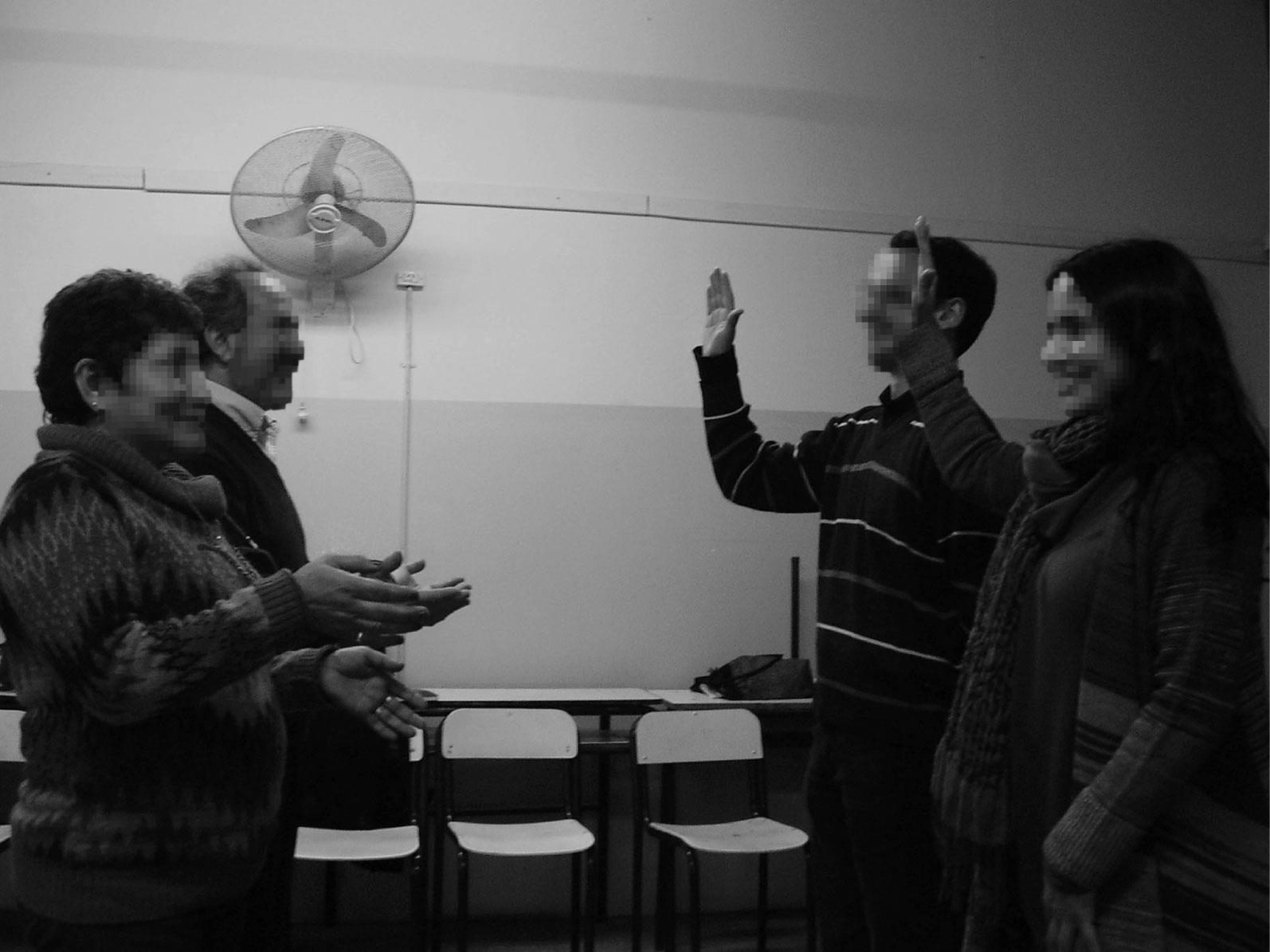 A partir de las tres primeras etapas varios participantes del taller reconocieron que la situación así como estaba planteada era un problema debido a que, por ejemplo, los dos personajes que representaban estudiantes estaban incómodos en el lugar que ocupaban. Por esa razón se pasó a la cuarta etapa del dispositivo, que propone mostrar en escena nuevos modos de intervenir y se interroga acerca de las emociones que esta modificación genera. A continuación se comparten dos cambios de intervención propuestos, por su potencia para el análisis.