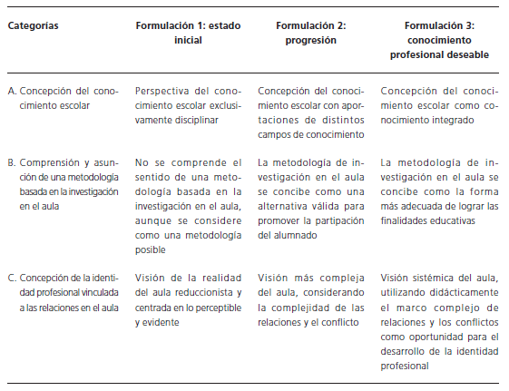 Apreciamos, pues, una evolución del desarrollo profesional del docente que afecta a diversas dimensiones de su profesionalidad, representadas por las categorías de análisis que hemos utilizado: concepción del conocimiento escolar, comprensión y asunción del modelo metodológico de trabajo en torno a problemas y concepción de la identidad profesional vinculada a una comprensión más compleja de las relaciones en el aula. Se trata de un proceso que, una vez puesto en marcha, puede continuar evolucionando hacia la meta de docente deseable que el propio profesor considera y que estaría representada –como se dijo anteriormente– por las formulaciones de valor 3 de las categorías (ver cuadro 1).