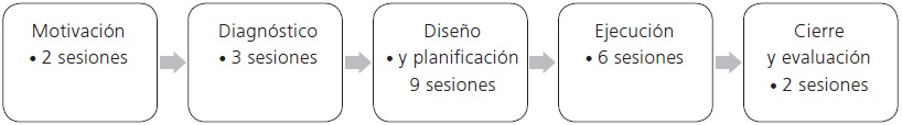Los proyectos de aprendizaje-servicio se estructuran en cinco fases (Tapia, 2010). Para llevarlo a cabo se realizaron 22 sesiones de 45 minutos cada una, las cuales se organizaron como muestra la figura 1.