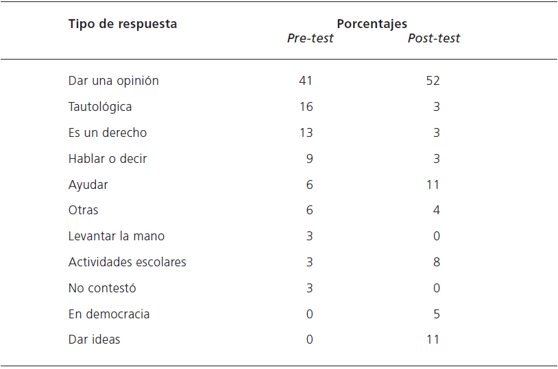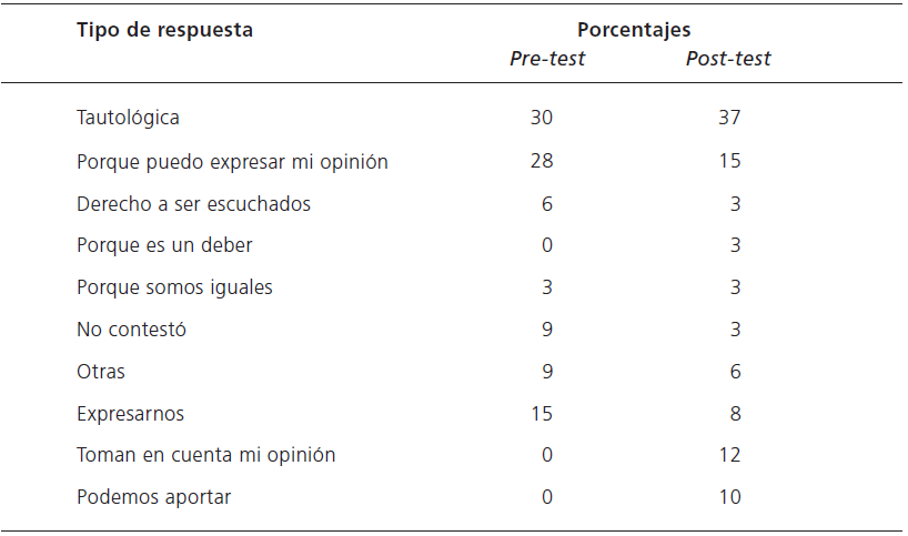 Al analizar la tabla 2 se puede observar que antes de la intervención el primer lugar lo ocupan las respuestas tautológicas (30%), en segundo término los estudiantes opinaron que su participación es un derecho porque representa la posibilidad de expresar su opinión (28%). Es importante destacar que después de la intervención hubo dos nuevos tipos de respuestas: “Toman en cuenta mi opinión” (12%) y “Podemos aportar” (10%), que merecen ser destacados debido a que surgieron como nuevos elementos de análisis después de la puesta en marcha del proyecto. En dichos tipos de respuestas se observa que los alumnos consideran la participación como un paso más allá que el simple hecho de emitir una opinión, señalando que es un derecho debido a que ellos también tienen la oportunidad de influir en el proyecto al aportar algo, expresándose y siendo tomados en cuenta.