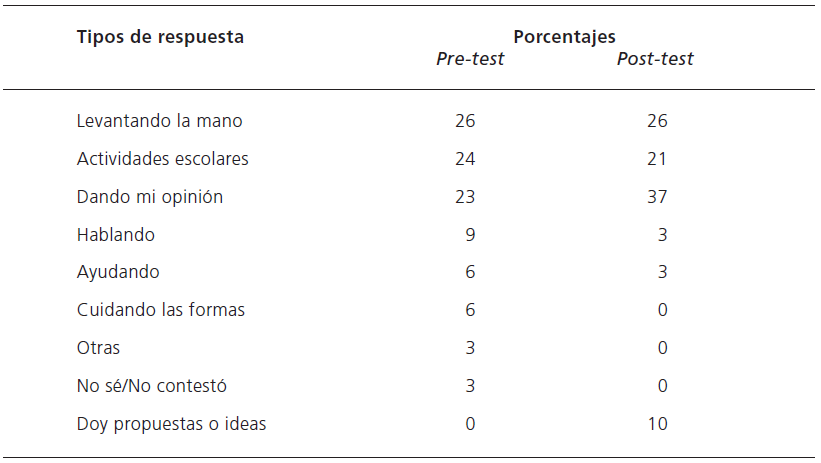 Como se observa en la tabla 3, los resultados antes de la intervención señalan que las formas de participar en el aula son, en primer lugar, “Levantar la mano” (26%), seguido de “Actividades escolares” (24%) y de “Dar una opinión” (23%). Después de la intervención se encuentra que el primer tipo de respuesta es “Dar una opinión2 (37%), seguida de “Levantar la mano” (26%) y “Actividades escolares” (21%). Se puede inferir de ambos resultados que su participación en el aula es muy limitada y responde a la apertura o guía del adulto, que son formas de partición simple (Novella y Trilla, 2014) puesto que los alumnos no inciden en la toma de decisiones de la actividad que están realizando. Sin embargo, después del proyecto surgen respuestas que aluden a dar ideas o propuestas, lo que permite señalar un grado mayor de implicación, yendo más allá del modelo de enseñanza tradicional pasivo en donde el alumnado sigue las indicaciones del profesor, memoriza las temáticas y luego es evaluado por medio de un examen (Feito y López, 2008).