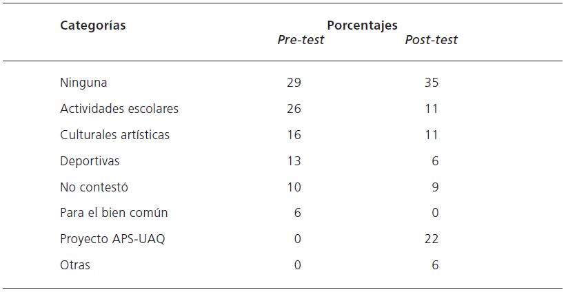 Como puede advertirse en la tabla 4, los alumnos expresan en primer lugar no haber sido invitados a realizar alguna actividad tanto antes como después de la intervención. Este es un dato que resulta importante destacar debido a que esos jóvenes no son tomados en cuenta en la vida cotidiana de las escuelas, salvo, por ejemplo, como señalan las respuestas antes de la intervención, para actividades escolares (como hacer honores, preguntando o leyendo en clases). Llama la atención que después de la intervención aparece en segundo lugar una nueva categoría que se denominó “Proyecto APS-UAQ”, con 22%, que hace referencia a las actividades que los alumnos realizaron en el proyecto de APS, entre ellas, participar en la radio, en las entrevistas y cuando se acudió a la UAQ. Lo anterior permite ver el impacto que este proyecto generó en ellos y la oportunidad que esto representa para posteriores actividades, debido a que el proyecto, además de ser una propuesta para la participación de los estudiantes, es una estrategia pedagógica que les permitió adquirir habilidades, conocimientos y competencias de diversas materias, que los involucró en una actividad que fue de su interés y por medio de la cual se buscó resolver una problemática social de su comunidad.