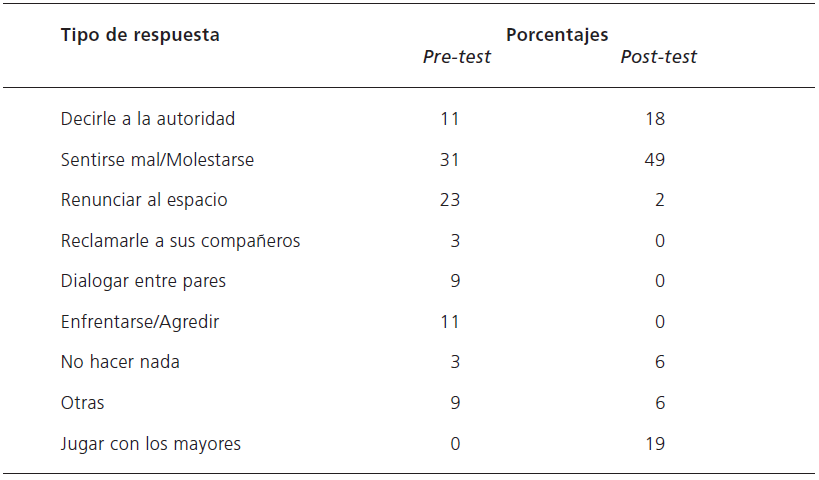 Como puede observarse en la tabla 5, antes de la intervención señalan que los estudiantes creen que los más pequeños deben, como primer lugar de los tipos de respuesta, “Sentirse mal/molestarse” (31%), seguida de “Renunciar al espacio” (23%) y, en tercer lugar, “Enfrentarse/agredir” y “Decirle a la autoridad” (11% en ambos casos). Los cambios realmente destacables que hubo después de la intervención son la aparición de un nuevo tipo de respuesta: “Jugar con los mayores”, que señala la importancia que los alumnos le dan a la convivencia con los demás compañeros, y la reducción en respuestas como “Renunciar al espacio” y “Enfrentarse/agredir”.