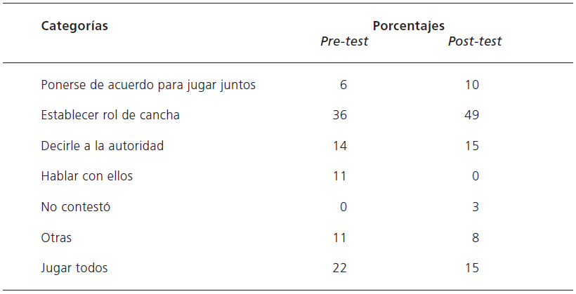 En la tabla 6 se puede observar que antes de la intervención, el primer tipo de respuesta fue “Establecer un rol de cancha” (36%) seguida de “Jugar juntos” (22%) y, en tercer lugar, “Decirle a la autoridad” (14%). Después de la intervención nuevamente se encuentra la respuesta de “Establecer un rol de cancha” (49%) como la de mayor porcentaje, seguida de “Decirle a la autoridad” (15%) y, en tercer lugar, “Jugar juntos” (15%). Destaca que si bien es cierto que después de la intervención el porcentaje de “Jugar juntos” se redujo, se advierte un incremento en el tipo de respuesta “Ponerse de acuerdo para jugar juntos” (10%), lo que confirma lo señalado en la tabla 5 en cuanto a observar la forma como los alumnos se acercan o perciben la resolución de los conflictos, abriendo otras opciones para su resolución, como acordar, dialogar o concertar.