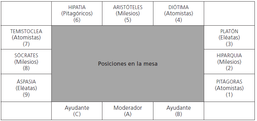Las posiciones en la mesa fueron previstas por el moderador desde dos variables: sexo y universidad de procedencia (Figura 1), quedando los participantes de forma intercalada con base en estos atributos.