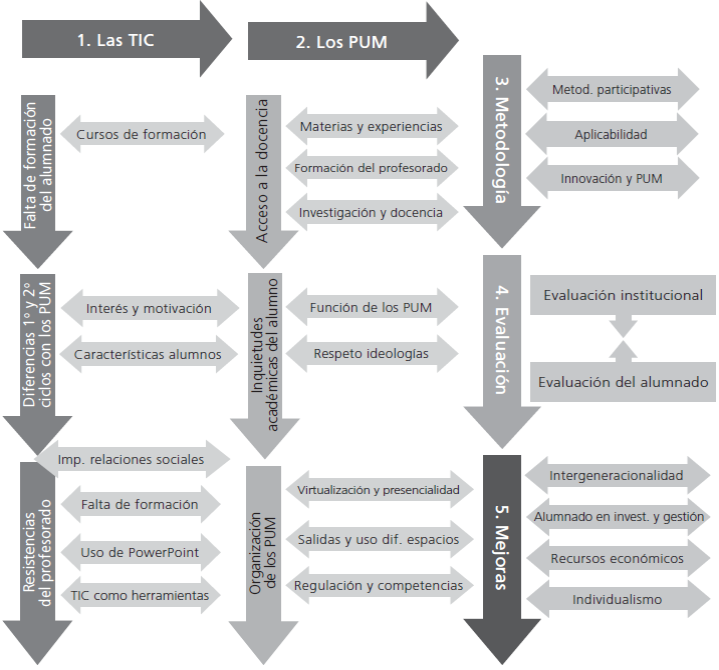 Enlazando con la necesidad de sensibilización y formación en cuanto a las TIC para los docentes (o parte de ellos), emerge una realidad: la escasa y deficiente formación permanente del profesorado universitario en general y de los participantes de los PUM en particular. Se demanda una clara apuesta por parte de las universidades en esta dirección; salir de la voluntariedad y comenzar a trabajar desde la obligatoriedad, especialmente en lo que se refiere a la formación en metodología docente. Si bien hemos constatado el carácter marcadamente vocacional de este profesorado, siempre atento a las necesidades del alumnado en la línea de lo apuntado por Bermejo (2005) y Agudo, Pascual y Fombona (2012), precisa de una puesta al día específica que vaya desde aspectos básicos de toma de conciencia sobre características de los mayores (tanto físicas como psíquicas) hasta el conocimiento de técnicas que faciliten la interacción en el aula, la motivación y las relaciones sociales entre los estudiantes, tan demandadas por ellos, sin olvidar las enormes potencialidades educativas que las TIC pueden ofrecer en este sentido.