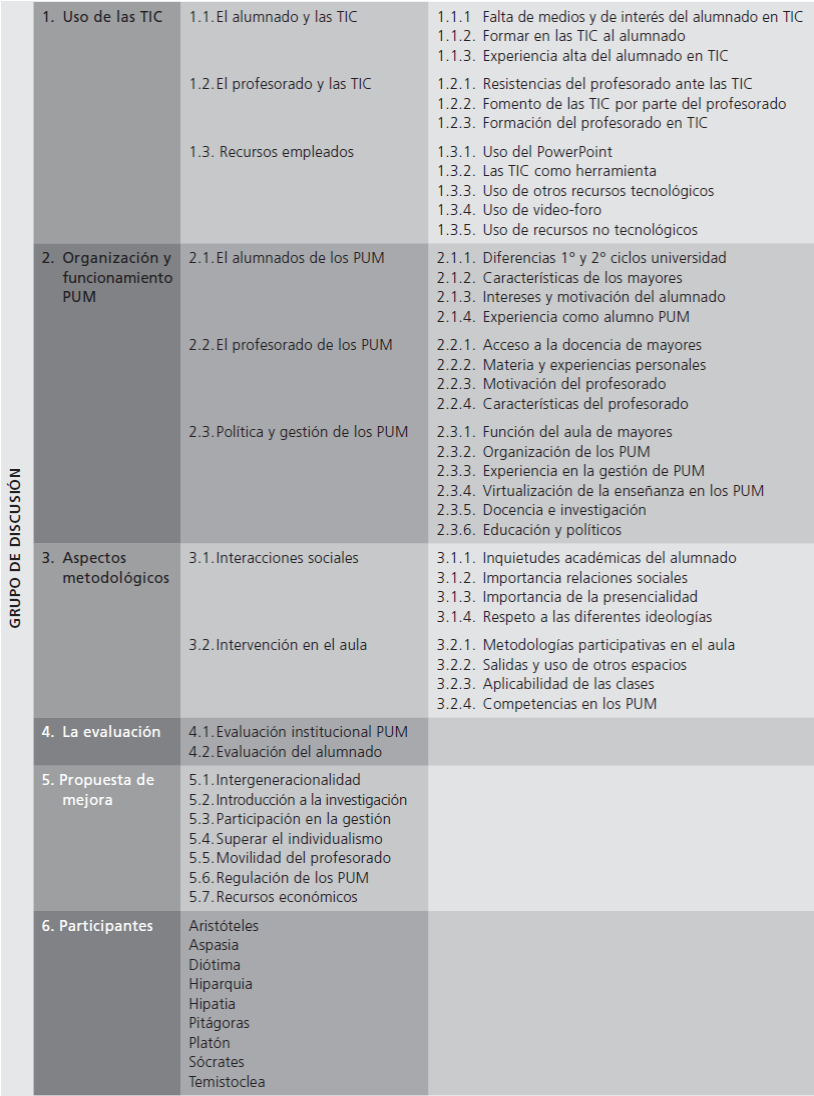 El grupo de discusión es una metodología de amplio bagaje académico (Alonso, 1998; Canales y Peinado, 1995; Ibáñez, 1979, 1991 y 1994; Krueger, 1991; Martín Criado, 1997; Mena y Murillo, 2006; Gutiérrez Brito, 2008; Ortí, 1989; Ruiz, 1996; Suárez, 2005; Vallés, 1997; Verón, 1993). Esta técnica indaga en las actitudes y reacciones de un grupo social específico, frente a un asunto social o político, o bien un tema de interés como un producto, concepto, idea, etcétera, partiendo de una pregunta generadora (Ibáñez, 1979); en nuestro caso, docentes de cuatro diferentes PUM, cuyo tema de debate girará en torno hacia los aspectos más importantes de su docencia en dicho contexto (perfiles del alumnado, metodologías, dificultades, etcétera), en general, así como el uso de las TIC en particular. Nuestra pregunta generadora fue la siguiente: ¿Qué métodos y recursos docentes piensas que son los más adecuados para captar el interés del alumnado en los Programas Universitarios para Mayores? Muy especialmente, nos interesa el papel que desempeñan las TIC y las ventajas e inconvenientes que plantean su uso.