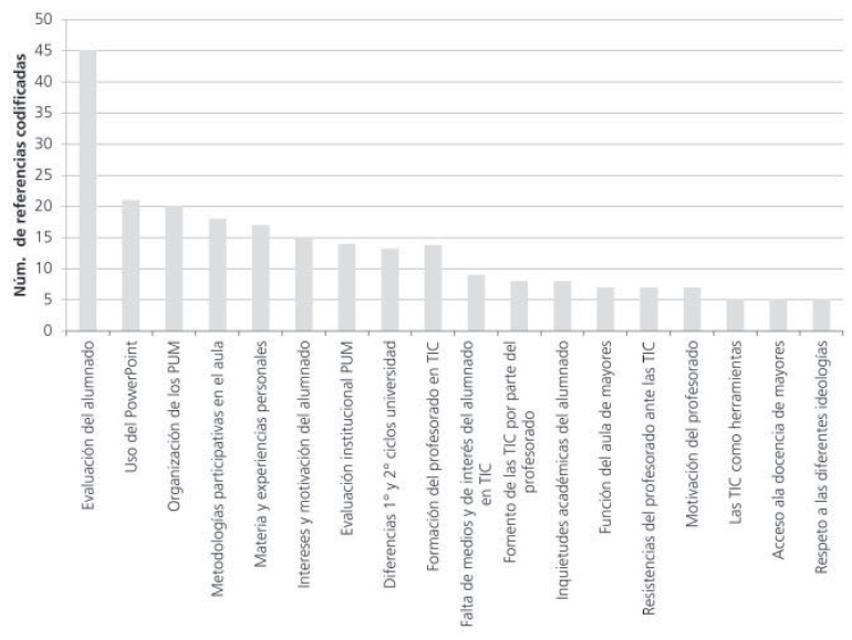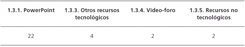 Si analizamos las codificaciones existentes en el discurso del grupo de discusión (Tabla 2) en relación con las referencias sobre los recursos utilizados en el PUM, es evidente que el uso del PowerPoint sobresale con diferencia frente a otros recursos. Existen 22 párrafos sobre su uso, frente a cuatro que relatan el empleo de otros recursos tecnológicos, dos que mencionan el video-foro y otros dos que comentan sobre la utilización de recursos no tecnológicos.