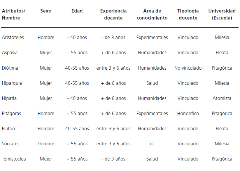 Siguiendo las pautas marcadas por Canales y Peinado (1995), Ibáñez (1979) y Vallés (1997), el factor de homogeneidad es la pertenencia al ámbito docente universitario: el grupo de discusión se realizó con docentes de los PUM de cuatro universidades españolas (Málaga, Complutense, Alicante y Las Palmas). En cuanto a los factores de heterogeneidad son los identificados en los atributos en la Tabla 1. Concretamente los participantes se ajustaron a las siguientes pautas: equilibrio entre hombres y mujeres; distribución equilibrada por sexo (5 mujeres y 4 hombres) y edad (2 menores de 40, 3 entre 40 y 55 y 4 con más de 55 años) con base en el perfil docente de los PUM; se siguió el criterio anterior en cuanto a experiencia en este tipo de docencia; distribución equilibrada por área de conocimiento (4 de humanidades, 2 de experimentales, 2 de salud y 1 de TIC); se optó por dar preferencia a personal vinculado (docentes de plantilla fija) frente a no fijos (1 docente no vinculado y otro honorífico); y por último, se optó por contar con cuatro universidades (escuelas) que se distribuyeron los participantes con base en la presencia en el proyecto y accesibilidad al punto de realización del grupo (Madrid). En total, en este grupo participaron de nueve personas, más un moderador del grupo y dos observadores.
