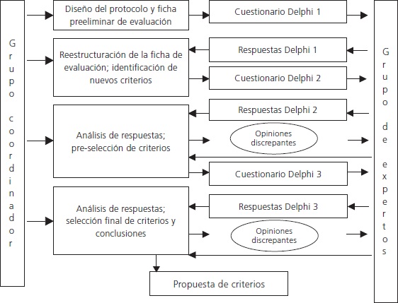 En este estudio usamos un proceso de recogida de opiniones grupales, consensuadas y fidedignas, mediante el método Delphi, un proceso sistemático, interactivo y colaborativo encaminado a la obtención de opiniones y consenso a partir de experiencias y juicios subjetivos de expertos (Scapolo y Miles, 2006; Pozo-Llorente, Gutiérrez-Pérez y Rodríguez-Sabiote, 2007). Se acude a esta técnica cuando se requiere una clarificación de los criterios de evaluación o categorías de análisis, por ser un campo novedoso y no existir datos suficientes a priori para perfilar la interpretación del objeto de estudio.