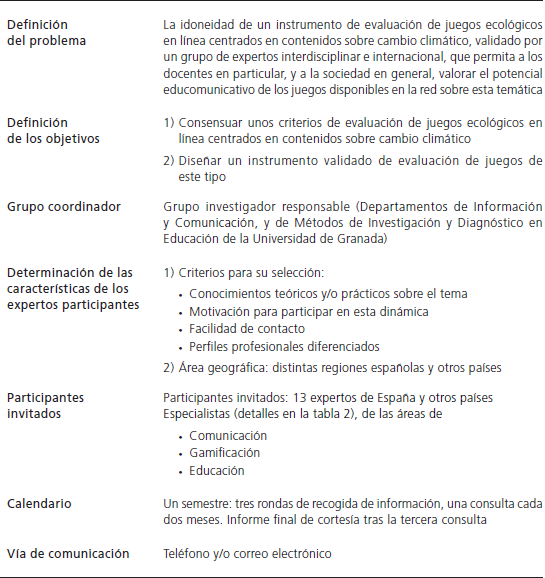 En esta fase se diseñó el protocolo de la técnica Delphi: definición tanto del problema como de objetivos, identificación de variables o criterios, constitución del grupo coordinador, establecimiento de las características y perfiles de los expertos, así como del calendario y de la estrategia de participación con los especialistas. La Tabla 1 resume los descriptores básicos.