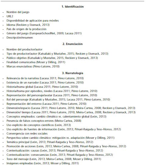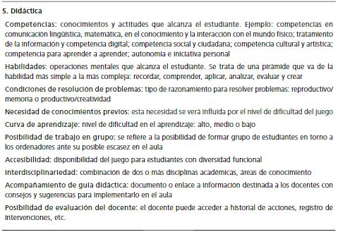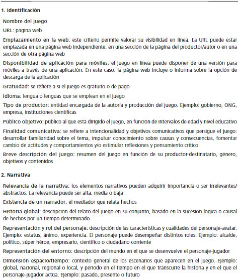 Esta primera propuesta consistió en una ficha de evaluación preliminar, inspirada en el modelo de análisis de la significación del videojuego, de Pérez-Latorre (2010). A la visión comunicativa que caracteriza a este modelo, se añade un enfoque pedagógico, con el fin de evaluar su potencial educativo de cara a su introducción en el aula. La ficha de evaluación quedó dividida en cinco dimensiones, que sirven de guía para clasificar los criterios de evaluación desde el prisma comunicativo y educativo: 1) identificación (rasgos que ayudan a identificar y localizar el juego); 2) enunciación (juego como proceso de diálogo); 3) narratología (como narración); 4) ludología (como juego); y 5) didáctica (como recurso educativo).