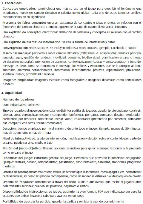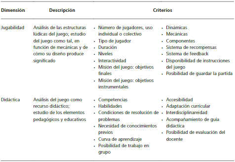 Los criterios de evaluación (variables de análisis) fueron los elementos a analizar en cada uno de los juegos en línea. Éstos se determinaron tras una exhaustiva revisión bibliográfica desde la perspectiva de su potencial para realizar un análisis de contenido y del discurso de los videojuegos como herramientas de comunicación, además de permitir valorar su capacidad pedagógica, como paso previo a su implementación en contextos educativos. La Tabla 3 presenta cada una de las dimensiones con sus respectivos criterios de evaluación iniciales.
