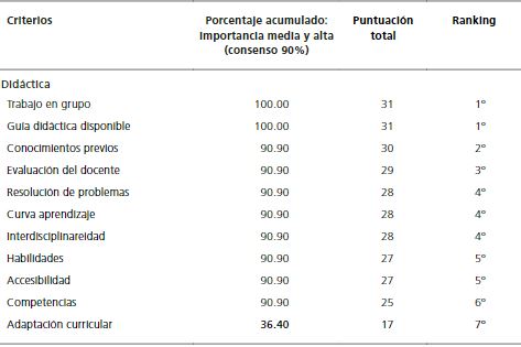 Finalmente, en la dimensión didáctica, destacan los criterios de disponibilidad de guía didáctica, el trabajo en grupo, la necesidad o no de conocimientos previos y la posibilidad de evaluación del docente.
