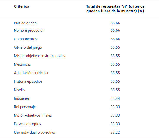 3) Finalmente, se solicitó a los expertos un posicionamiento desde sus respectivas áreas de experiencia ante aquellos criterios que no superaron la segunda fase, con el fin de calibrar consenso y confirmar la selección final de criterios. Esta valoración se planteó a través de un cuestionario con preguntas cerradas dicotómicas, en el que los expertos debían responder si estaban de acuerdo o no en que los criterios con un consenso menor de 90% se quedaran fuera del instrumento de evaluación de juegos en línea sobre cambio climático.