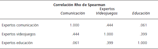 Aunque los tres grupos de expertos de distintos perfiles de nuestra pequeña muestra coincidieron en la eliminación de los 14 criterios en el instrumento de evaluación, el análisis de las respuestas específicas de esta última ronda para cada criterio pone de manifiesto ligeras diferencias entre los grupos en función del campo de especialización. Destaca el hecho de que los expertos en educación y comunicación fueron los que más optaron por volver a incluir nuevamente esos criterios de evaluación en la selección final, mientras que los especialistas en videojuegos prefirieron excluir la mayoría de ellos. De hecho, estos últimos, a diferencia de los otros dos grupos de especialistas, optaron unánimemente por la exclusión de criterios de jugabilidad (como niveles, misión-objetivos instrumentales y componentes del juego) y, de forma mayoritaria, por la eliminación de criterios comunicativos tanto de narrativa como de análisis de contenido. Cabe destacar cómo la mayoría de los expertos en educación prefirieron que el criterio de adaptación curricular se quedara fuera, a pesar de ser un criterio más de la dimensión de didáctica, a diferencia de los expertos de comunicación que, en principio, optaron por la inclusión de este criterio en el instrumento de evaluación. La Tabla 7 muestra globalmente una correlación ligera en las valoraciones del conjunto de los criterios que hicieron los expertos en videojuegos con los educadores y expertos en educación (r= 0.44), mientras la mayor divergencia se aprecia entre los educadores y comunicadores que discreparon mayoritariamente en sus valoraciones de conjunto como lo muestra la ausencia de correlación (r= 0.061).