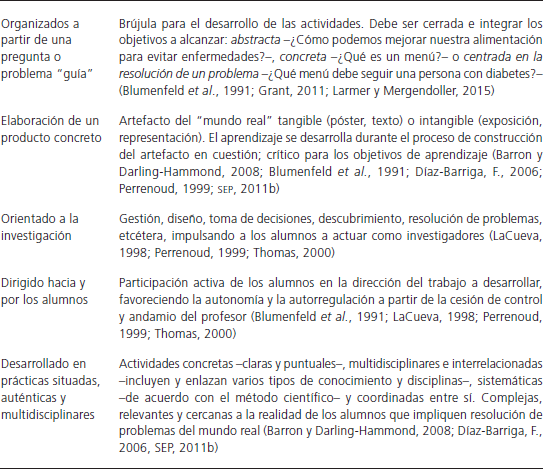 Como hemos señalado hasta ahora, la enseñanza y la evaluación de competencias pueden llegar a ser procesos muy complejos para los docentes. Sin embargo, el ABPr es considerado como un binomio de enseñanza-evaluación auténtica, pues a través de la retroalimentación y la corrección propicia escenarios de aprendizaje que permiten enseñar al tiempo que se evalúa formativamente (Díaz-Barriga, F., 2006). Si bien el currículo de primaria establece los planteamientos sobre la implementación de los proyectos en el aula, desde nuestra perspectiva creemos pertinente retomar otros elementos que son necesarios considerar para hablar de un proyecto en sentido estricto. Así, para este estudio retomamos los elementos más significativos propuestos por diversos autores (Barron y Darling-Hammond, 2008; Bell, 2010; Blumenfeld et al., 1991; Díaz-Barriga, F., 2006; Grant, 2011; LaCueva, 1998; Larmer y Mergendoller, 2015; Perrenoud, 1999; SEP, 2011b; Thomas, 2000), integrándolos en la siguiente definición: