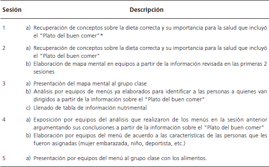 Este proyecto tuvo una duración de cinco sesiones en el transcurso de dos semanas, durante las que los alumnos se organizaron en equipos para trabajar colaborativamente en las diferentes actividades para elaborar el producto final (Tabla 3).