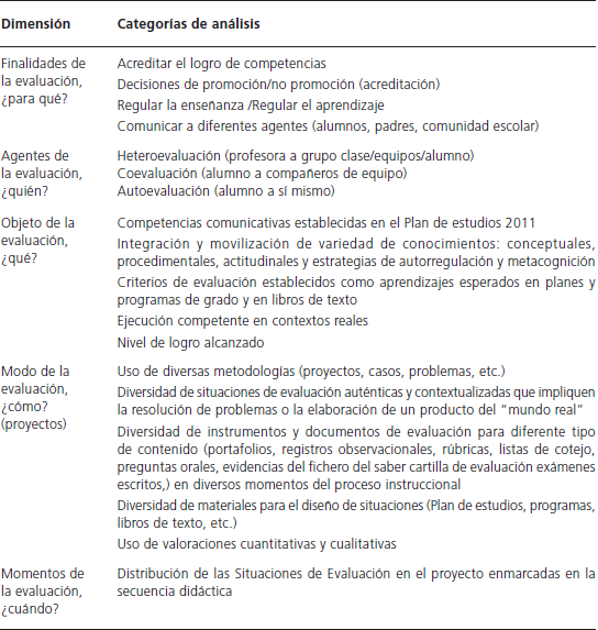 Para el análisis de los datos se utilizó un modelo multidimensional de naturaleza constructivista, sociocultural y situado (Coll, Barberà y Onrubia, 2000; Coll, Mauri y Rochera, 2012) que comporta cuatro grandes dimensiones de análisis: enfoque, programa, situaciones y tareas. De acuerdo con los objetivos de este trabajo presentamos la parte del análisis que se centra, específicamente, en las situaciones de evaluación (SE), entendidas como aquellos fragmentos del proyecto en los que se observa la intencionalidad de constatar los aprendizajes en términos de competencias que tienen o que han adquirido los alumnos sobre los contenidos de Español y Ciencias naturales. Para identificar y caracterizar dichas situaciones de evaluación en el proyecto “Hacer un menú” consideramos los siguientes elementos: finalidades: propósitos específicos por los que realiza la evaluación; agentes: sujeto responsable de valorar los aprendizajes en términos de competencias; objeto: foco en el que se centra el proceso evaluativo; modo: formas, cualidades y/o condiciones en las que se desarrolla la evaluación; y momentos: ubicación temporal de la evaluación en el marco del proyecto. La Tabla 4 muestra las diferentes categorías de cada una de las dimensiones consideradas.