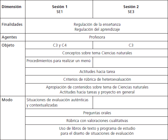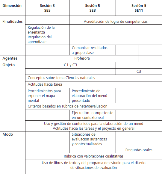 En primer lugar, hemos constatado cuatro tipos de situaciones de evaluación que se diferencian en función de las principales finalidades a las que van dirigidas (regular la enseñanza, el aprendizaje, acreditar el logro de competencias, etc.) y los agentes escenciales de la evaluación (profesor o alumnos que autoevalúan su trabajo o el de sus propios compañeros). La identificación del conjunto de SE nos ha ofrecido un marco referente desde el que logramos tener una lectura más ajustada y precisa sobre el complejo proceso de evaluar aprendizajes en términos de competencias. Por un lado, nos permitió obtener una panorámica global de las valoraciones realizadas por la profesora, a partir del conjunto de las distintas SE, atendiendo a la dimensión temporal en la que se ubican, pues no todas son iguales ni sirven para lo mismo: en aquellas realizadas por la maestra, las SE al inicio del proyecto permiten recuperar los conocimientos previos; durante el desarrollo y al final, comprobar que los aprendizajes realmente han sido adquiridos. En cuanto a las llevadas a cabo por los alumnos pudimos observar que, a medida en que avanza el proyecto y al final del mismo, se van incorporando SE para promover la reflexión y la autorregulación. Por otro lado, nos fue posible advertir cómo se entrelazan las diferentes SE en el proceso de enseñanza y aprendizaje, que gira en torno a un proyecto de Español, de acuerdo con los postulados teóricos que enfatizan la necesidad de interrelacionar la enseñanza, el aprendizaje y la evaluación (Coll, Martín y Onrubia, 2001; Coll, Mauri y Rochera, 2012).
