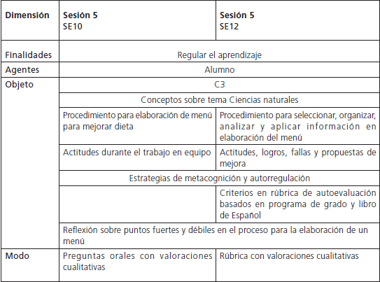 Finalmente, en relación con el TiSE IV —autoevaluación de lo aprendido—, observamos que se presenta en dos ocasiones durante la última sesión (Tabla 8). En el caso de la SE10, a través de preguntas orales que realiza la profesora al grupo en general, los alumnos identifican los nuevos conocimientos que adquirieron: “¿Qué fue lo más interesante que revisamos? ¿Podemos elaborar un menú para nosotros para llevar una dieta equilibrada?”. Por su parte, en la SE12 se usa una rúbrica de autoevaluación (ver Anexo E) basada en el libro de texto de Español, que incorpora reflexiones de los alumnos sobre sus logros, dificultades y lo necesario para mejorar su proceso de aprendizaje en el futuro siendo el único instrumento que considera elementos relacionados con la asignatura de Español: “Toma notas de la información principal que proporciona un texto”, “Organiza adecuadamente la información principal de un texto”. En estas dos SE hay valoraciones cualitativas de los tres tipos de contenido.