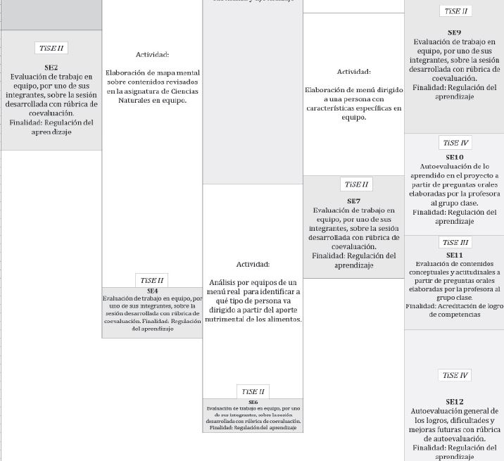 A lo largo de las cinco sesiones en las que se desarrolló el proyecto “Hacer un menú” identificamos doce situaciones de evaluación que categorizamos en cuatro tipos (TiSE) de acuerdo con sus finalidades y los principales agentes involucrados en ellas. El TiSE I —recuperación de conocimientos previos— lo realizó la profesora, al inicio del proyecto, para recuperar los diferentes contenidos de Ciencias naturales con fines de regulación, tanto de enseñanza como de aprendizaje. El TiSE II —evaluación entre alumnos— lo llevó a cabo un alumno diferente en cada sesión para valorar la participación de los integrantes de los equipos durante el proyecto, con el propósito de regular del aprendizaje. El TiSE III —comprobación de lo aprendido— fue una evaluación realizada por la profesora, durante el transcurso del proyecto, para constatar si los aprendizajes habían sido adquiridos con dos finalidades diferentes: regular la enseñanza y el aprendizaje o acreditar el logro de competencias. Por último, el TiSE IV —autoevaluación de lo aprendido— lo llevaron a cabo los alumnos, en la última sesión, para reflexionar sobre los nuevos conocimientos adquiridos con el objetivo de regular el aprendizaje. A continuación caracterizaremos cada uno de estos TiSE, en función del orden en el que aparecieron durante el proyecto (Figura 2), acentuando nuestra atención en la información más relevante.