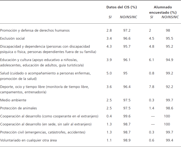 La baja participación declarada por nuestro alumnado también ha sido evidenciada en datos nacionales. Cuando se preguntó sobre la pertenencia y participación en grupos sociales, ningún colectivo superó el 9%. También en la participación como voluntariado las respuestas muestran esta tendencia a la baja, como se observa en la Tabla 1 (CIS, 2013).