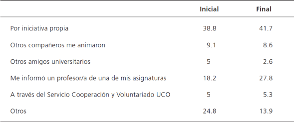 El alumnado que sí está vinculado con distintos colectivos sociales subraya como estrategia para entrar en contacto su propia iniciativa. Otras medidas que refieren son: me animaron otros estudiantes o me informó profesorado. Nos parecen especialmente relevantes dos elementos diferenciales entre el primer y segundo cuestionarios: por un lado, la prácticamente ausente influencia que el alumnado otorga a los servicios universitarios relacionados con el voluntariado y la cooperación a la hora de provocar su implicación, influencia que no cambia entre ambos momentos; en segundo lugar, el aumento de la alusión al profesorado como fuente de información en el momento final, lo cual podría señalar a la propia asignatura como posible herramienta de contacto y enlace con los colectivos (Tabla 2).