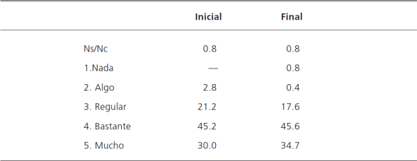 Estos datos variaron al finalizar la innovación docente, aunque los test de Wilcoxon y t-student no evidenciaron que la diferencia encontrada fuera significativa. Disminuye de forma leve el alumnado que manifestó no tener conocimiento sobre distintos colectivos sociales (pasando de 23.4 a 19.2%) y aumenta el que era voluntario y colaboraba de forma puntual o continuada con dichos colectivos (de 16% inicial a 19.2% final). Aunque las opiniones parecen haberse modificado solo levemente, alrededor de 3 puntos en cada caso, en los grupos focales se encontraron diferentes menciones destacables que apuntan hacia el aumento del conocimiento y del contacto con colectivos sociales tras la innovación, así como hacia la satisfacción que les ha producido.
