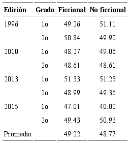 A pesar de que los textos ficcionales se caracterizan, en general por presentar una mayor densidad léxica que los literarios, en nuestros datos esto fue al revés. Los no ficcionales referidos por el proyecto Analyze My Writing (2017) obtuvieron 56.46, mientras que los incluidos en los libros de lectura apenas 48.77. La densidad promedio de los textos literarios de nuestro corpus coincide casi exactamente (49.22/49.4) con el de dicho proyecto.
