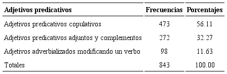 Posteriormente realizamos el análisis contextual de los adjetivos predicativos para determinar qué adjetivos se encontraban como copulativos, cuáles como predicativos (complementos o adjuntos) y cuáles como adverbializados. Los resultados de dicho análisis se presentan en la Tabla 11.