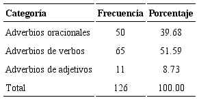 Respecto de la clasificación sintáctica de los adverbios terminados en -mente, encontramos que los que modifican verbos constituyen 51.59% de los del corpus. En la Tabla 12 se resume esta información.