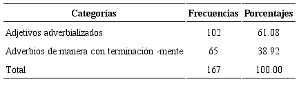 De acuerdo con nuestros datos, los adjetivos adverbializados constituyen 61.08% de los vocablos estudiados, mientras que 38.92% los adverbios con terminación -mente (Tabla 13). Al realizar la prueba de chi cuadrada (Chi2= 8.448, g.l.= 1, p= 0.003) observamos que existe una tendencia a usar con mayor frecuencia los primeros que los segundos.