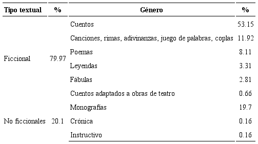 El C-TEN se compone de 540 textos divididos en ocho libros correspondientes a cada grado (primero y segundo de primaria) en sus ediciones 1996, 2010, 2013 y 2015. La mayoría de los textos compilados son de tipo literarios (79.97%) y el resto son no ficcionales, lo que coincide con los que tradicionalmente se han destinado para este momento de la alfabetización (Chartier, 2005). En la Tabla 1 presentamos la distribución según el género de los textos del C-TEN.