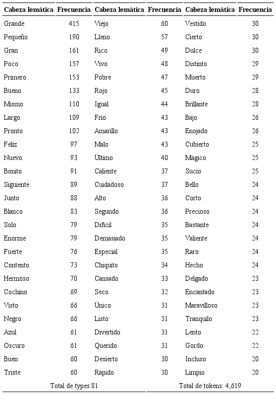 El C-TEN está constituido por 151 mil 33 palabras totales (tokens) de las que resultaron 15 mil 144 palabras diferentes o gráficas (types). De acuerdo con el foco que atiende el presente estudio, cabe precisar que el vocabulario fundamental del subcorpus de adjetivos presentó un total de 81 types y 4 mil 619 tokens. La Tabla 2 presenta en orden de frecuencia de aparición esos vocablos.