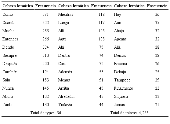 Respecto del vocabulario fundamental de adverbios, el C-TEN agrupa 36 lemas. Este subcorpus se encuentra 100% representado en el correspondiente de LEBEMEX (Lara, 1986). La Tabla 3 presenta la frecuencia en que aparecieron.